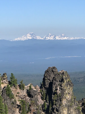 A beautiful view can be had at the top Paulina Peak, also part of the Monument.  On a clear day, you can see many snow covered peaks, including  Mt. Adams in Washington State to the north, and Mt. Shasta in California to the south.  Because of fires in the area, only Adams was visible.  The peaks in the background of this picture are of The Three Sister, just west of Bend.